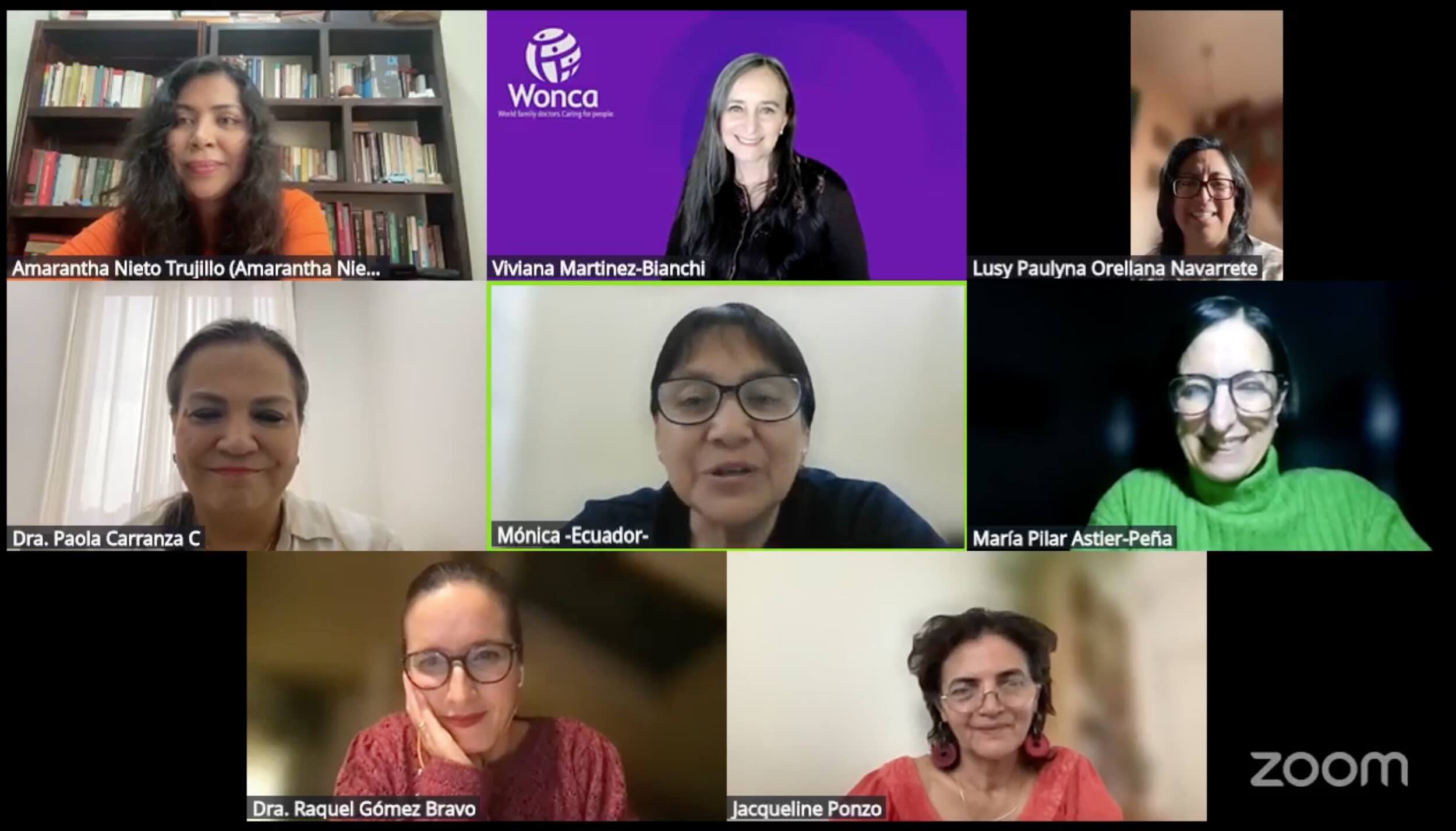 El panel contó con la participación de la Dra. Viviana Martínez-Bianchi, MD, presidenta de WONCA; la Dra. Amarantha Nieto Trujillo, de la Federación Mexicana de Especialistas y Residentes en Medicina Familiar y coordinadora del Grupo de Trabajo de Mujeres Médicas Familiares; la Dra. Raquel Gómez Bravo, MD, MSc, PhD, expresidenta del SIG de Violencia Familiar de WONCA; la Dra. María Pilar Astier Peña, MD, MSc, PhD, presidenta electa de WONCA y vicepresidenta del Grupo de Trabajo de Política y Abogacía de WONCA Europa; la Dra. Mónica Raimundo Carrera, médica familiar de Ecuador; y la Dra. Paola Carranza, coordinadora del Grupo de Mujeres Médicas de Familia de Colombia.
