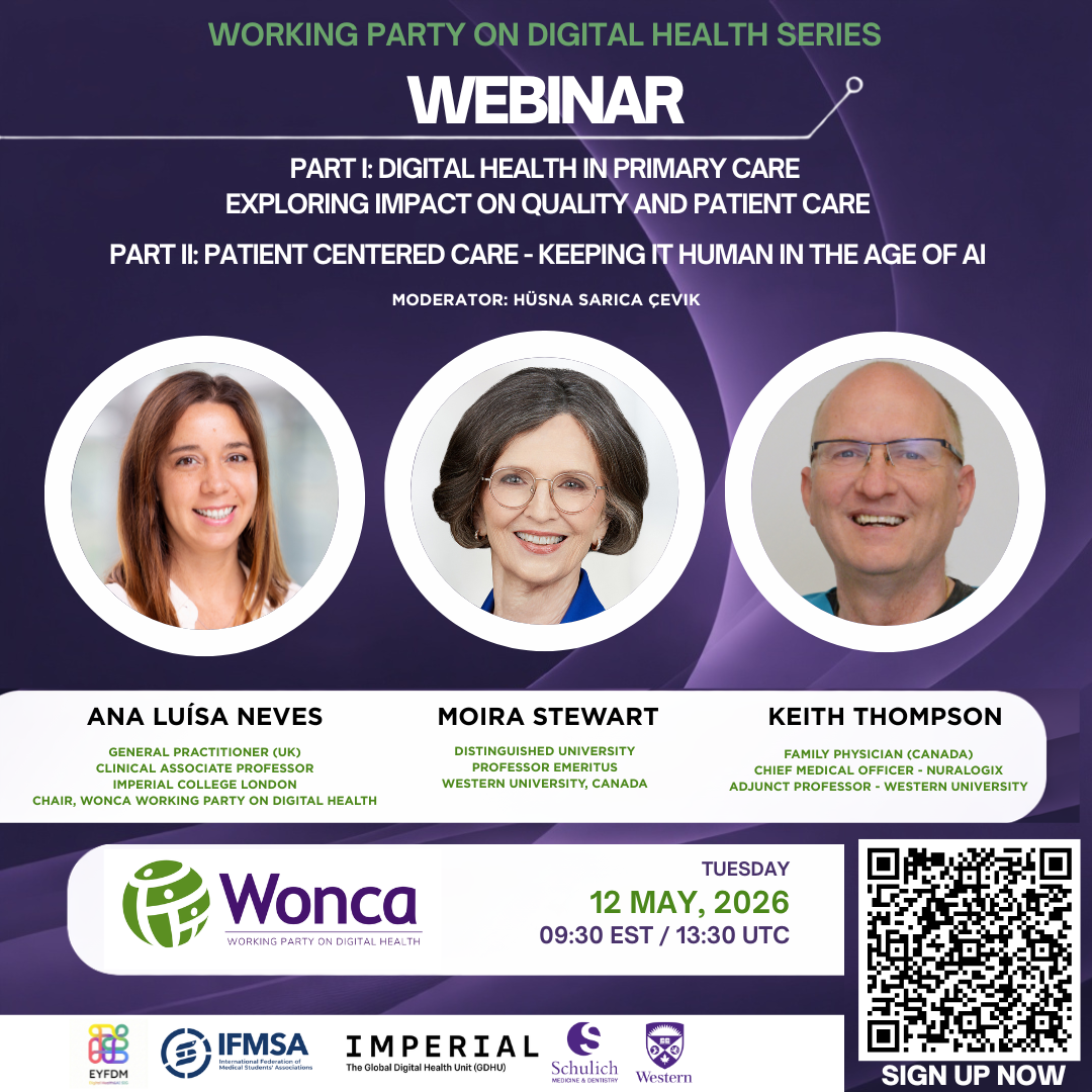 This webinar is part of a new international series of 10 sessions led by the WONCA Working Party on Digital Health, designed to support family doctors and primary care teams in understanding and integrating digital health into everyday clinical practice. Through a structured programme of sessions, the series aims to share practical, evidence-based insights and foster global exchange on the evolving role of digital technologies in primary care.